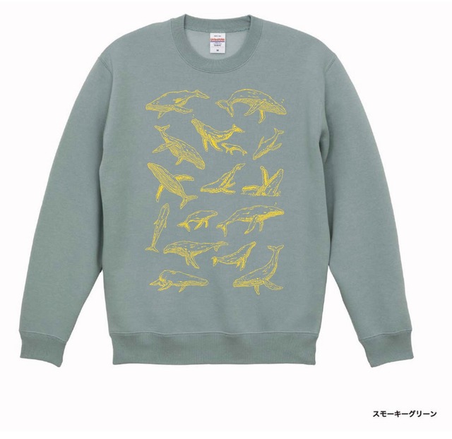 Whale Song クルーネックスウェット プリント:フロント Color:スモーキーグリーンボディ/イエロープリント united athle 10.0oz 裏起毛 サイズ詳細:画像参照